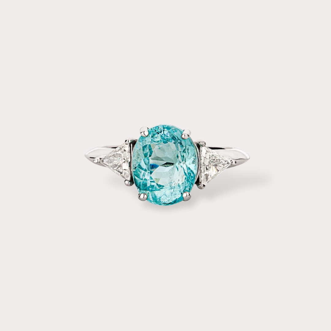 Anel em ouro branco 18K com 3,76ct em Turmalina Paraíba e 0,44ct em 2 diamantes, um ícone de elegância e exclusividade da Coleção Veneza.