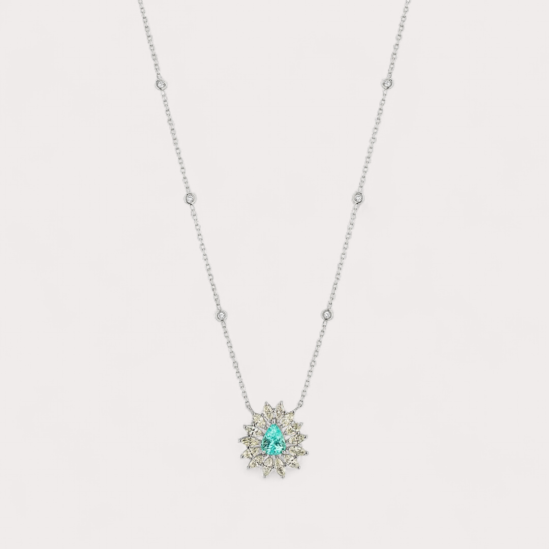 Colar em ouro branco 18K com 3,56ct em Turmalina Paraíba e 3,86ct em 22 diamantes, um encontro raro entre luminosidade e elegância da Coleção Veneza.
